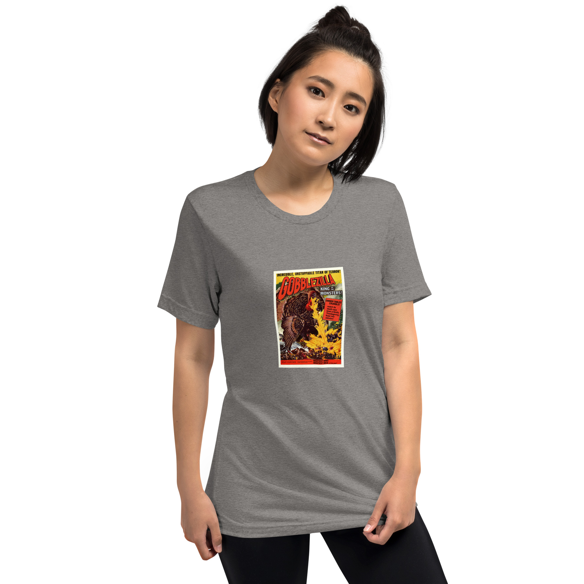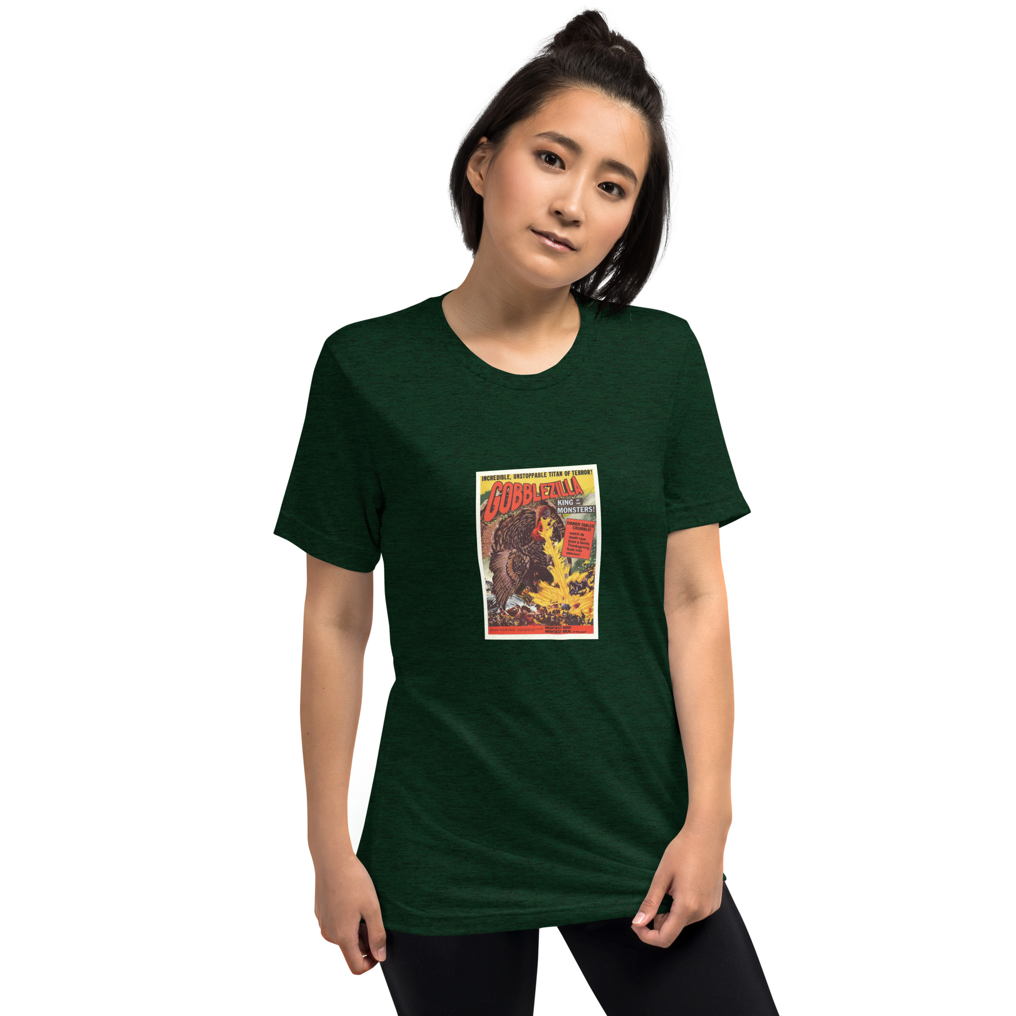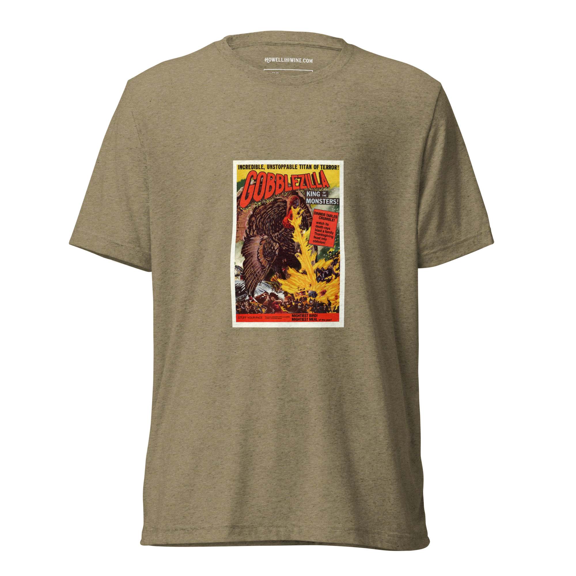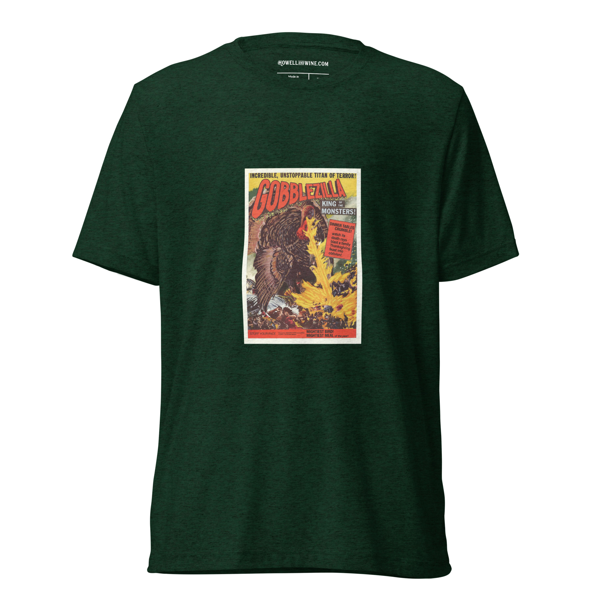 Hide the leftovers and evacuate the kitchen — Gobblezilla has risen! With death rays of cranberry sauce and stuffing shrapnel flying, this bird is serving apocalyptic entree energy. For those who like their Thanksgiving loud, proud, and slightly radioactive. The tri-blend fabric gives it that soft, vintage feel — tough enough to survive Thanksgiving and every wash after. Fitted, durable, and dangerously comfortable. Proceed with gravy caution.